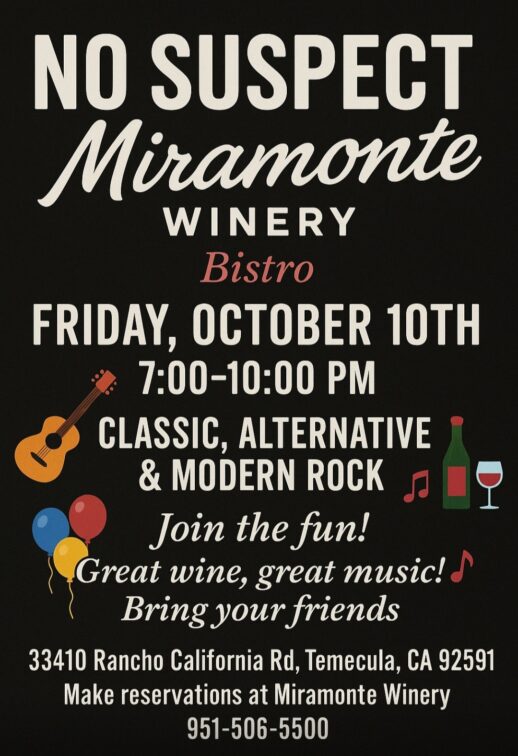 no-suspect No Suspect Miramonte Winery Bistro 41971 Main St, Temecula, CA 92590, USA / / October 10, 2025 7:00 pm queue_music Lineup Line Up Artist NavigationHome About MUSIC GALLERY Events Videos Contact Store
